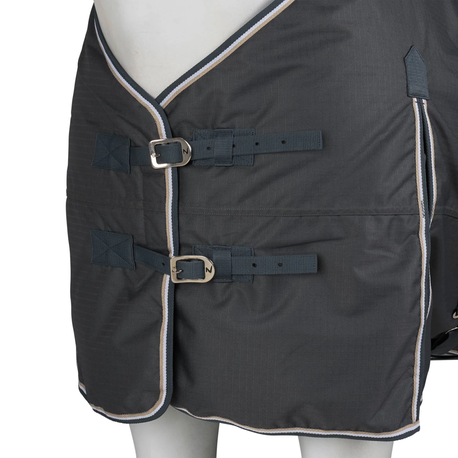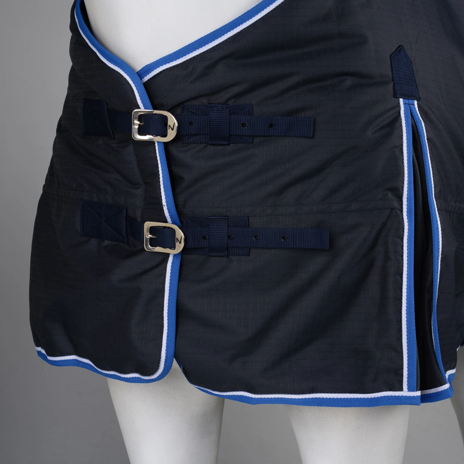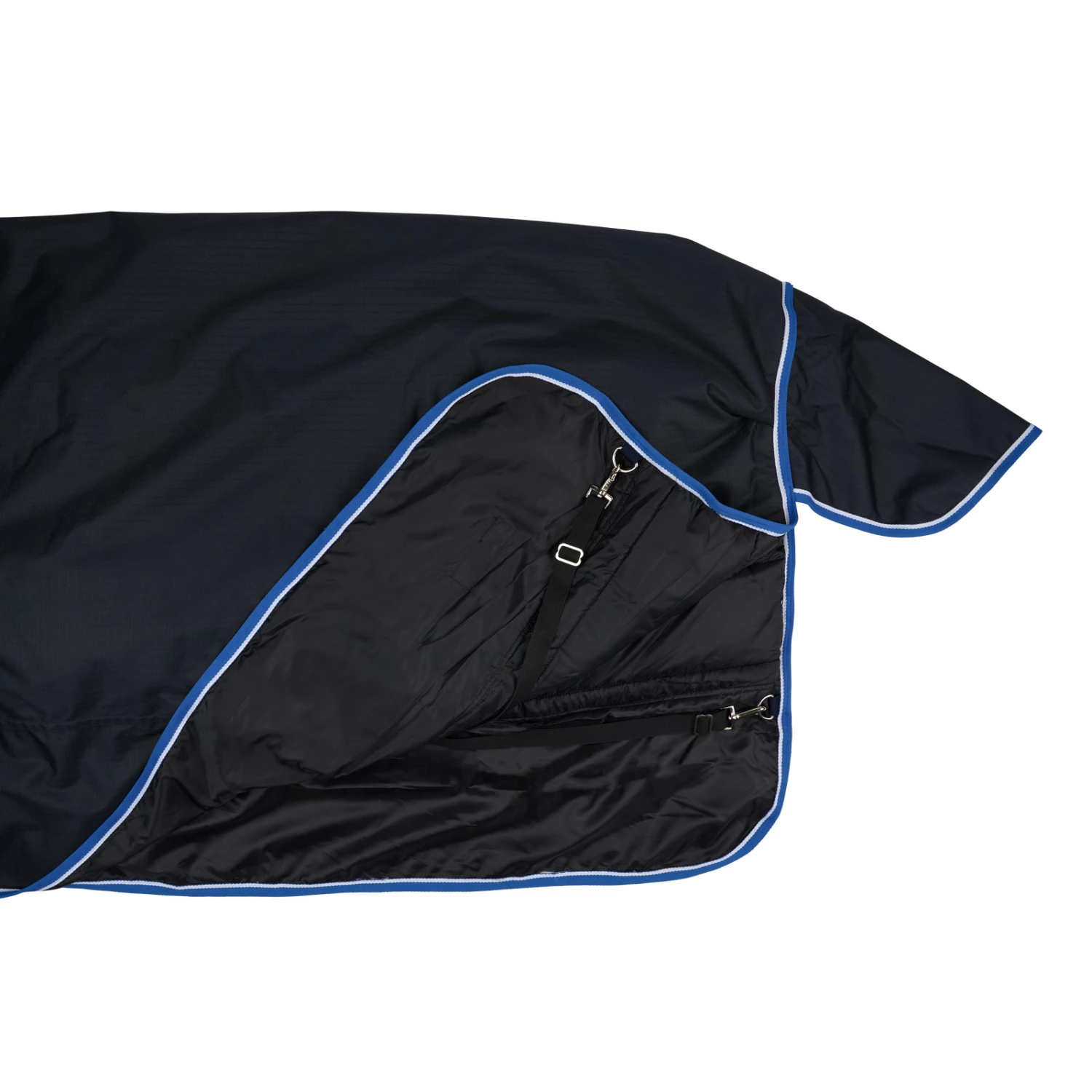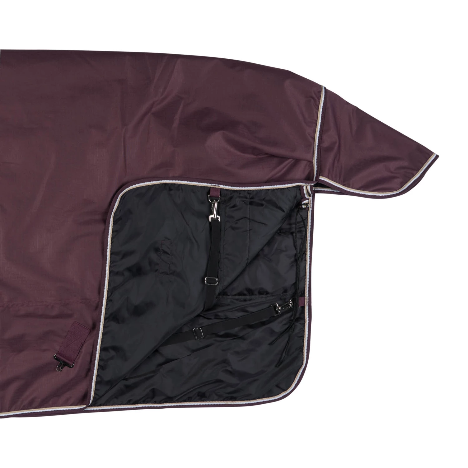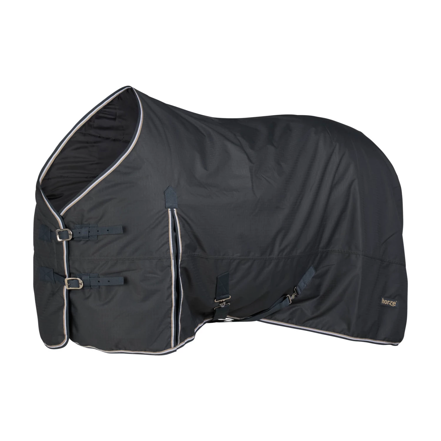 Diese Decke ist aus wasserdichtem, atmungsaktivem Material gefertigt. Der gute Sitz an Hals und Schultern macht sie bequem und die hohen Gehfalten bieten Bewegungsfreiheit, damit sich dein Pferd austoben kann und nicht eingeschränkt wird. Frontverschlüsse, Kreuzgurte und Beinschnüre halten die Decke sicher an ihrem Platz und verhindern Verrutschen.