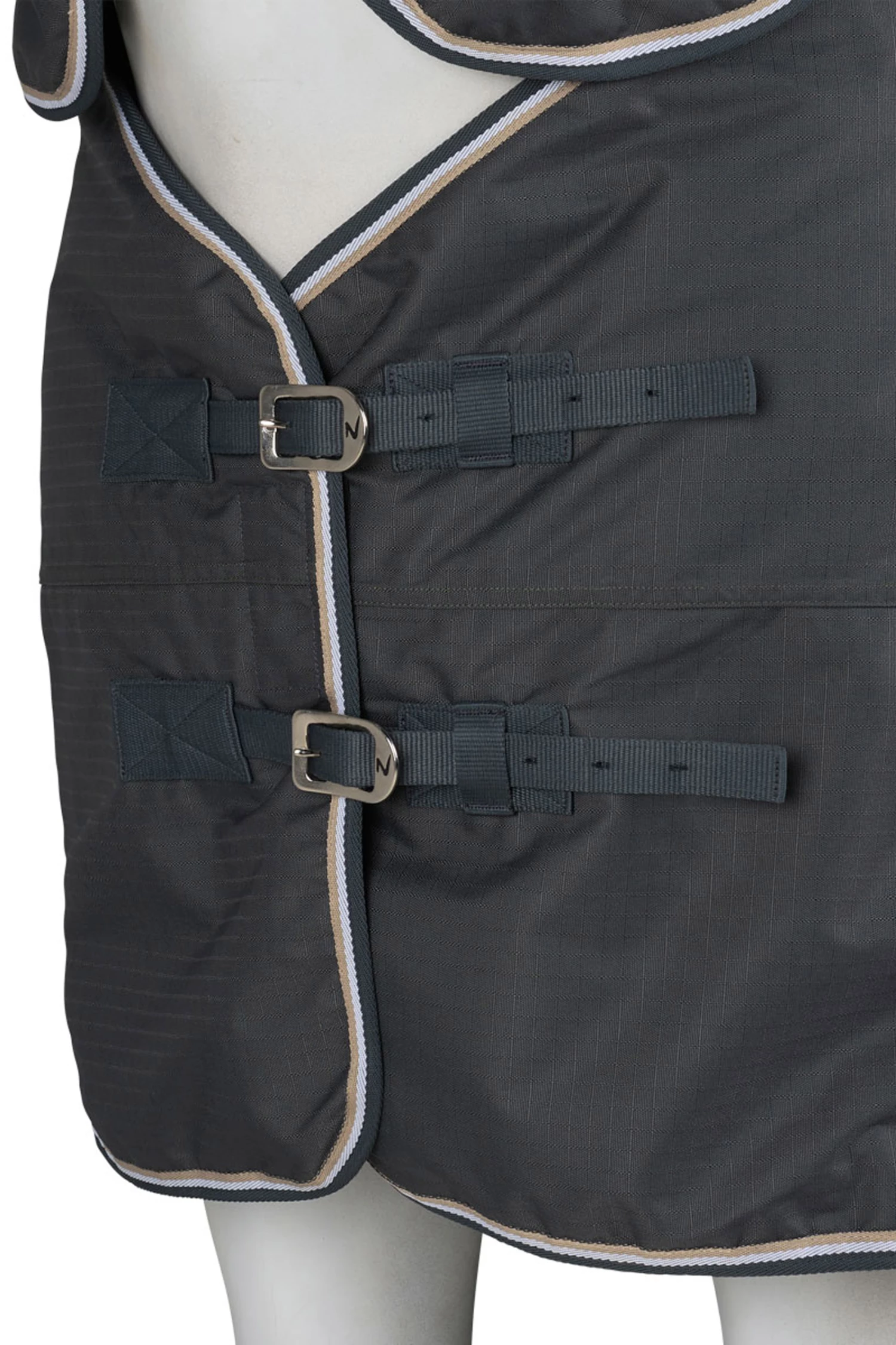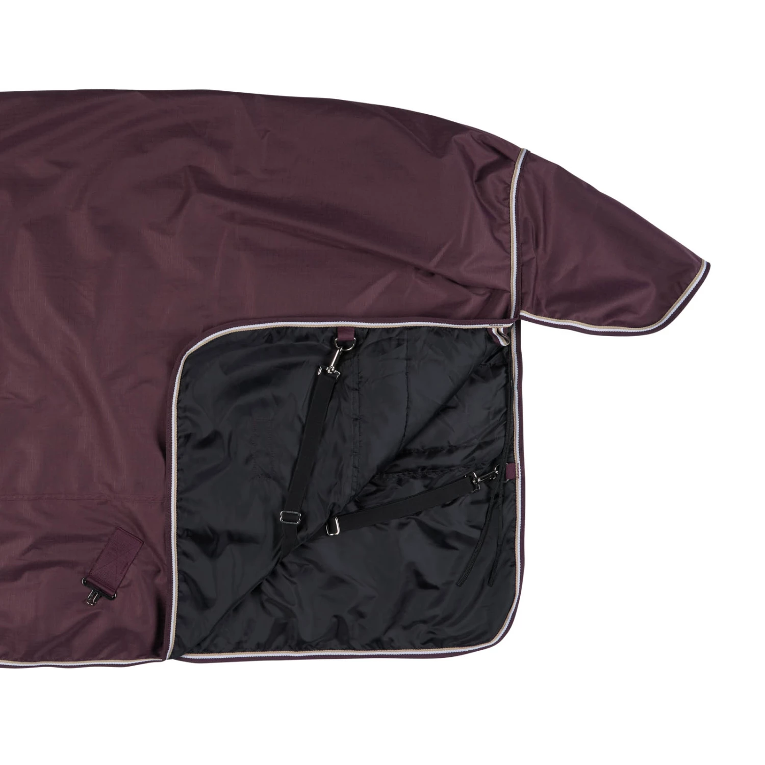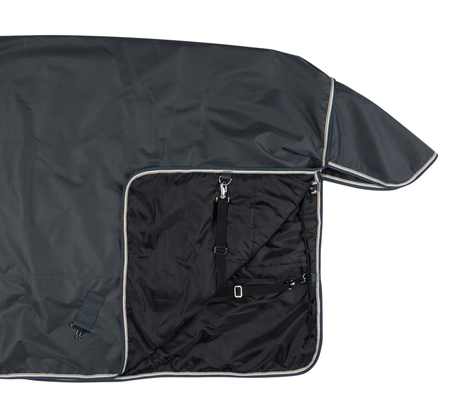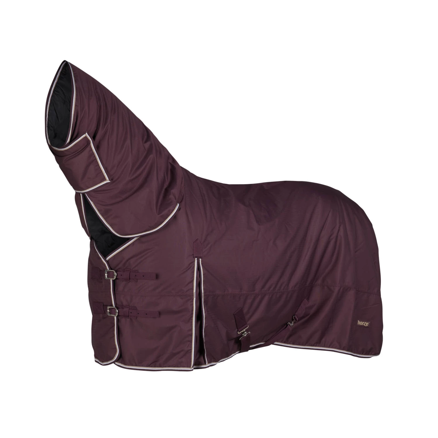 Diese Decke mit Halsteil ist aus wasserdichtem, atmungsaktivem Material gefertigt. Der gute Sitz an Hals und Schultern macht sie bequem und die hohen Gehfalten bieten Bewegungsfreiheit, damit sich dein Pferd austoben kann und nicht eingeschränkt wird. Frontverschlüsse, Kreuzgurte und Beinschnüre halten die Decke sicher an ihrem Platz und verhindern Verrutschen.