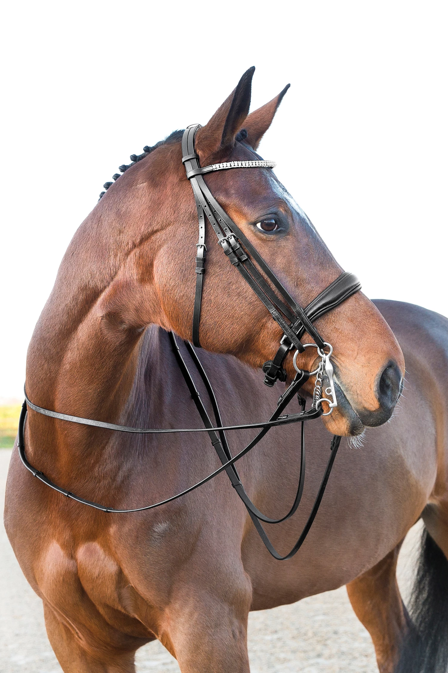 Mit diesem tollen Dressur-Zaumzeug mit gebogenem Stirnriemen und Akzenten aus Kristallen für einen Hauch mehr Eleganz im Viereck, setzen Sie ein Statement. Der breite, ergonomisch geformte Nasenriemen akzentuiert den Kopf. Polsterung an der Nase bietet Komfort und erhält noch den technischen Effekt. Premium Qualitätsleder und Beschläge aus Stahl komplettieren dieses klassische Zaumzeug. Kombinieren Sie die Kandare mit Ihren Lieblings-Zügeln von Horze.