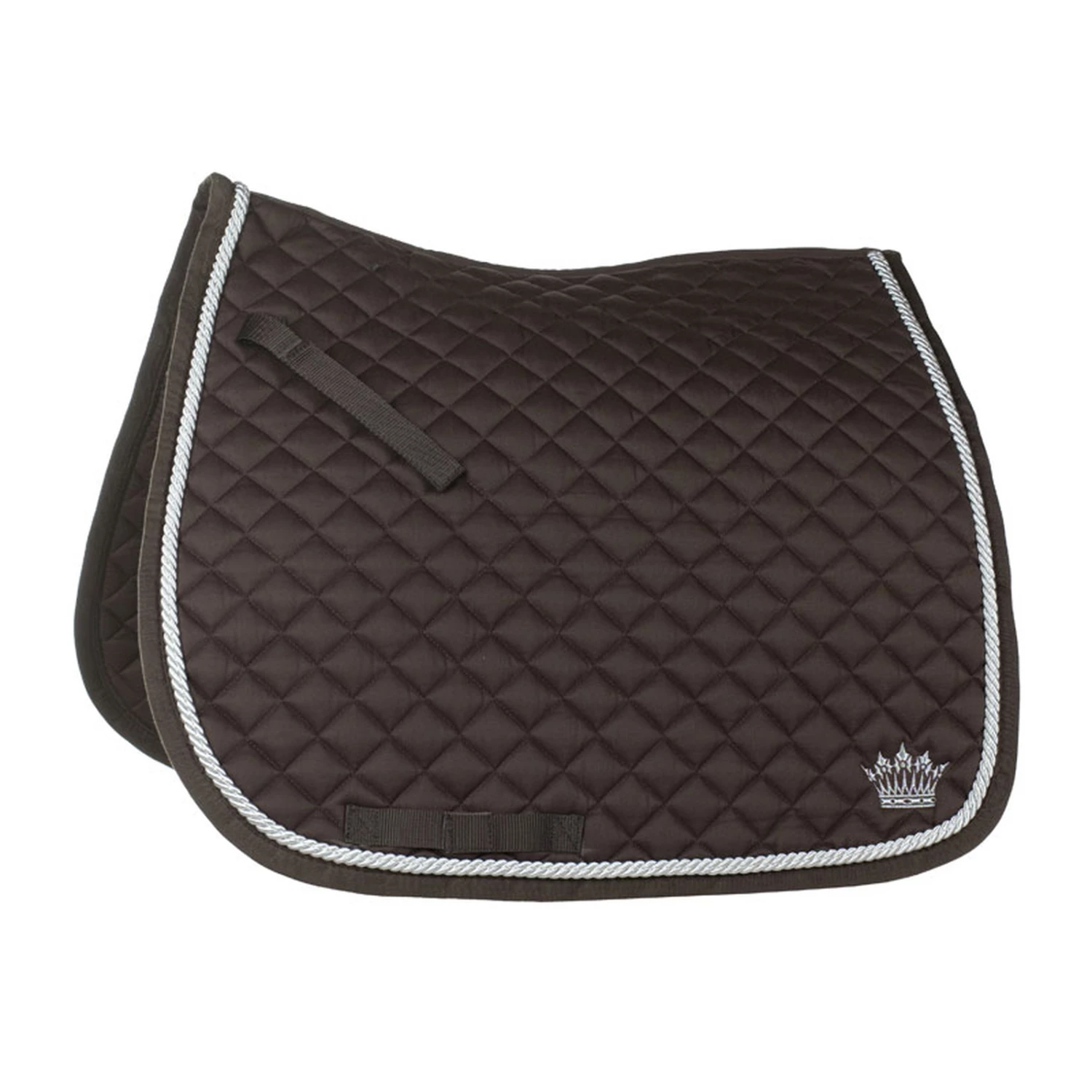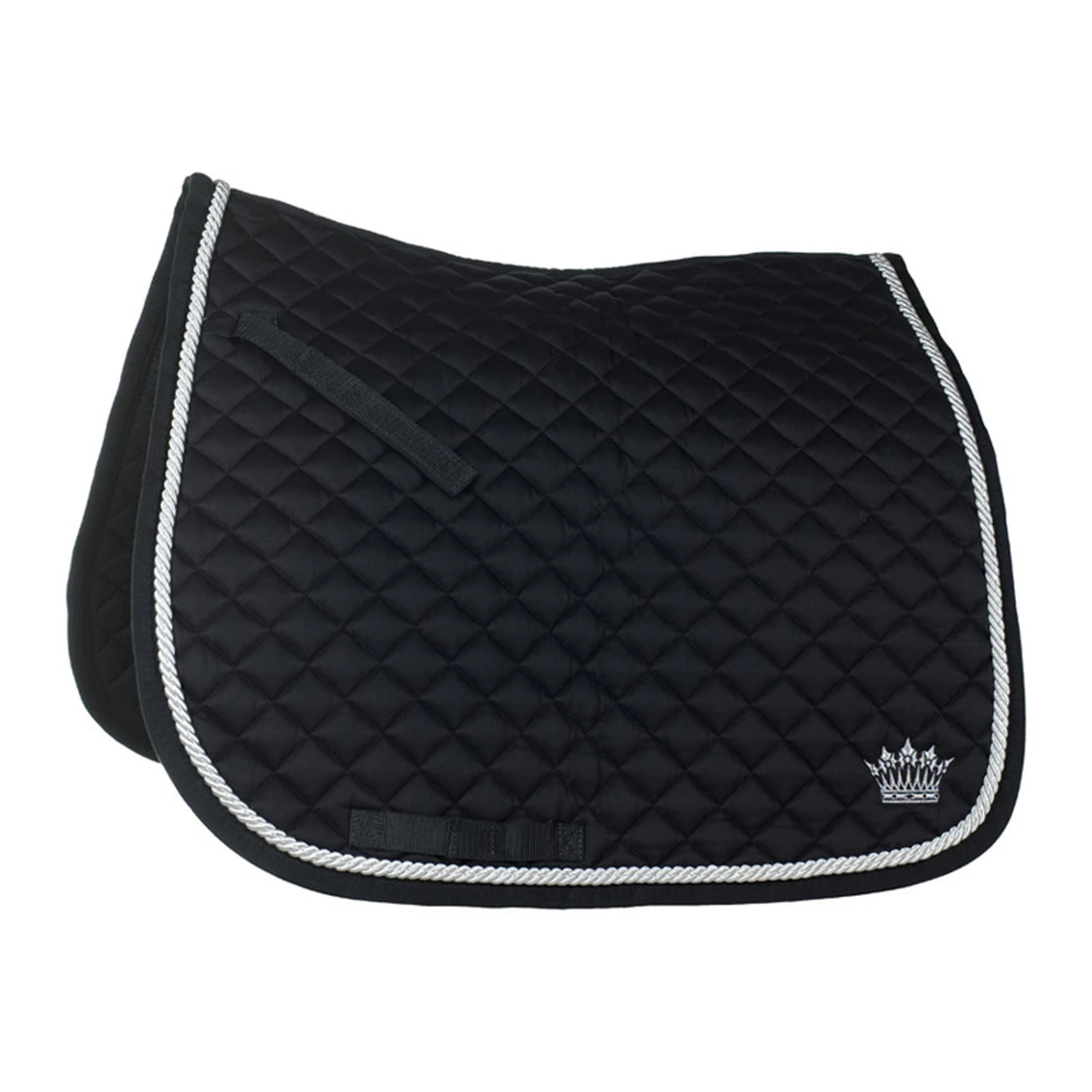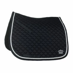 Eine wunderschöne, diamantförmige Steppung, ergonomische Form und außergewöhnliche Liebe zum Detail machen diese Dressurschabracke einzigartig. Dieses Pad wirkt wie eine schützende Barriere zwischen Sattel und Pferderücken. Es ist natürlich weich mit atmungsaktiver Baumwoll-Fütterung, um Feuchtigkeit abtransportieren zu können und den Rücken des Pferdes komfortabel zu halten. Das konturierte Pad folgt der natürlichen Form des Pferdes und eliminiert Reibungen, am Widerrist entsteht extra Freiheit um für noch mehr Komfort zu sorgen. Eine in silber gestickte Krone sitzt in der hinteren Ecke mit passender Einfassung aus silberner Kordel und so erscheint die Schabracke in einem modischen, definierten Look. Ihr Pferd wird von jedem im Stall beneidet werden wenn es dieses attraktive Sattelpad trägt! Sie wird mit Ihrem Namen oder Ihren Initialen aufgestickt wird wundervoll aussehen!