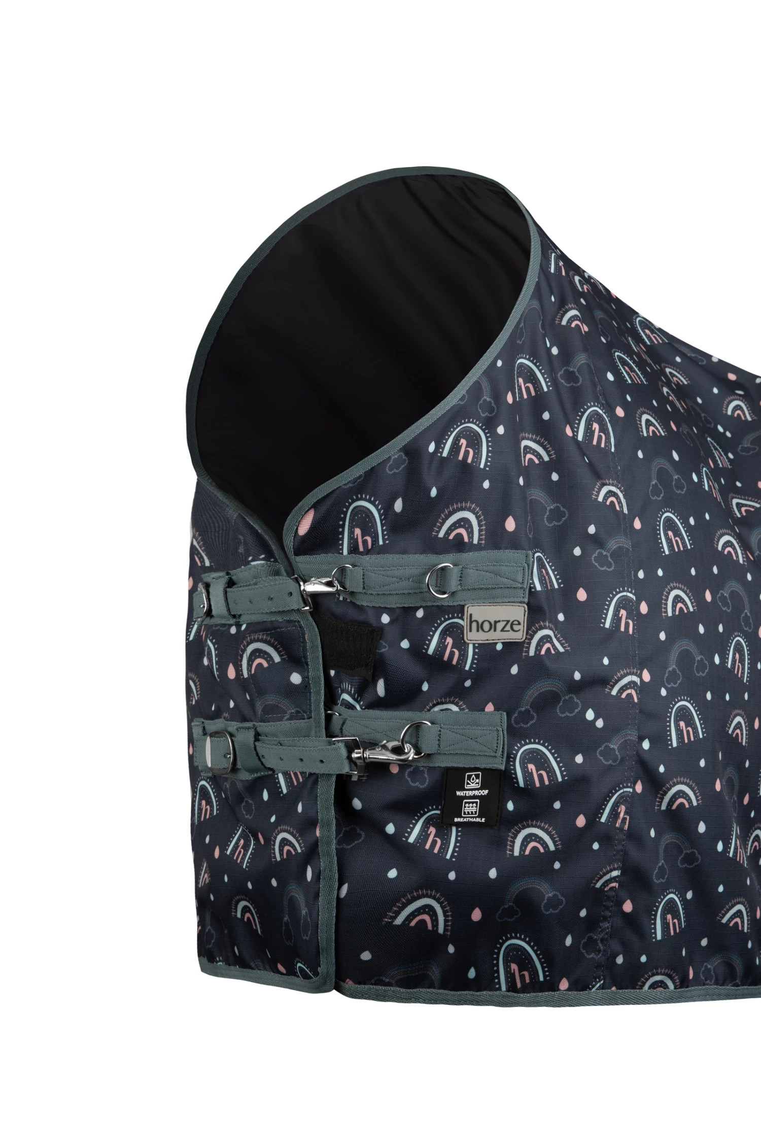 Die Horze Trixi Weidedecke für Ponys ist aus wasserdichtem Material gefertigt und in bunten Regenbogenfarben gestaltet. Silberne Beschläge verleihen ihr einen eleganten Touch. Zwei vordere Schnallen, Kreuzgurte und elastische Beingurte halten die Decke an ihrem Platz. Das schillernde Logo sorgt für ein gewisses Extra. Kombiniere diese Decke mit dem Rest unseres Horze Trixi Pony-Sortiments, um ein komplettes Outfit zu erhalten!