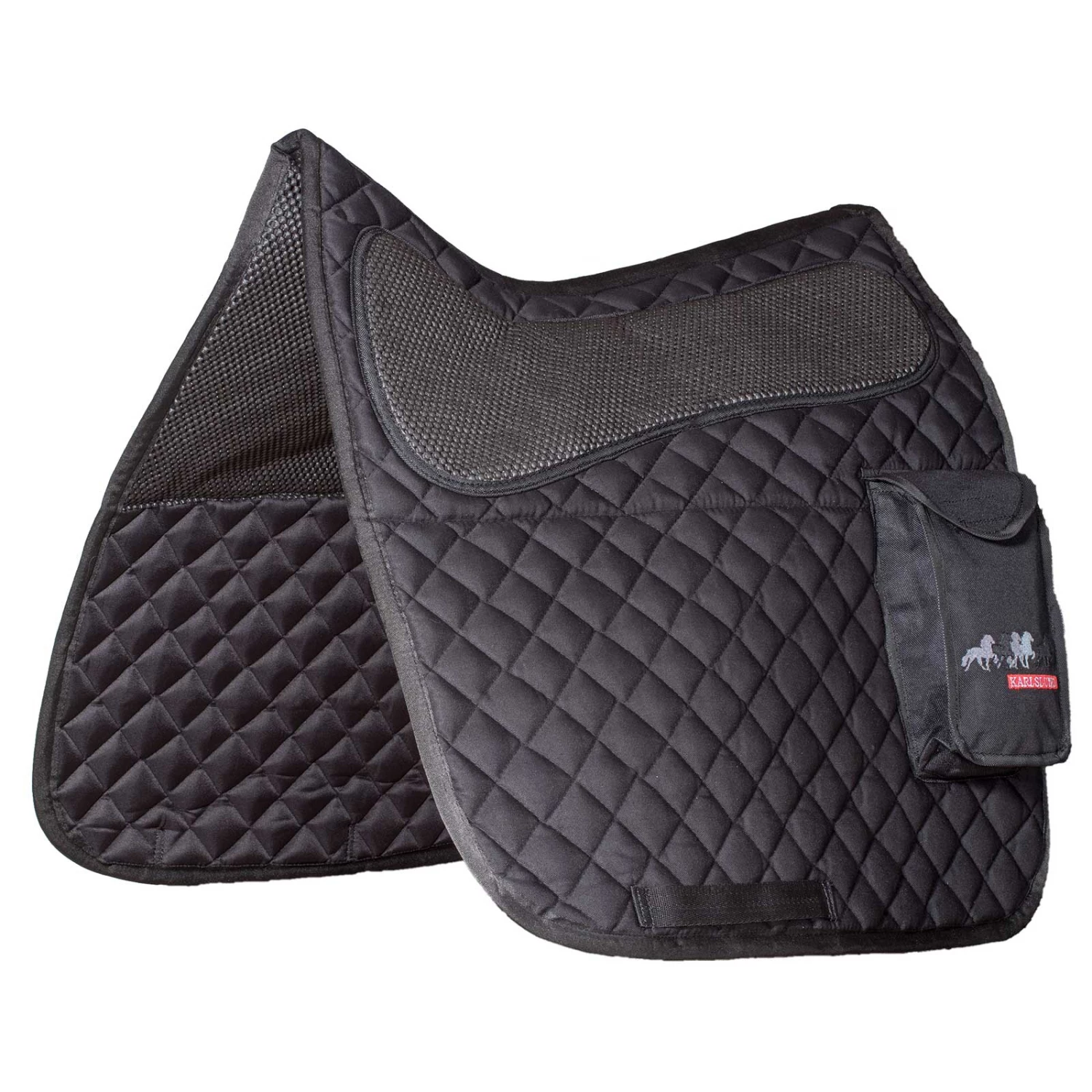 Anatomisch geformtes Sattel Pad mit extra Freiheit für den Widerrist, Anti-Rutsch-Funktion und Taschen auf beiden Seiten. Perfekt um beispielsweise eine Trinkflasche oder ein Halfter mitnehmen zu können.